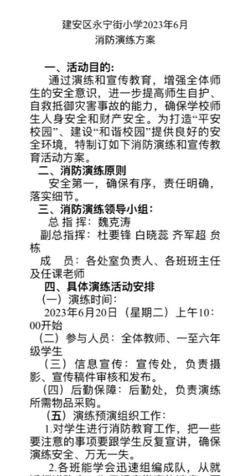 为进一步加强学校安全工作,营造安全、稳定、和谐的校园环境,使师生了解消防安全知识,增强师生消防安全意识,提高紧急有序疏散逃生能力,做到在发生火警火灾时临危不乱,确保生命安全,许昌市建安区永宁街小学于6月20日上午开展了消防安全演练活动。
