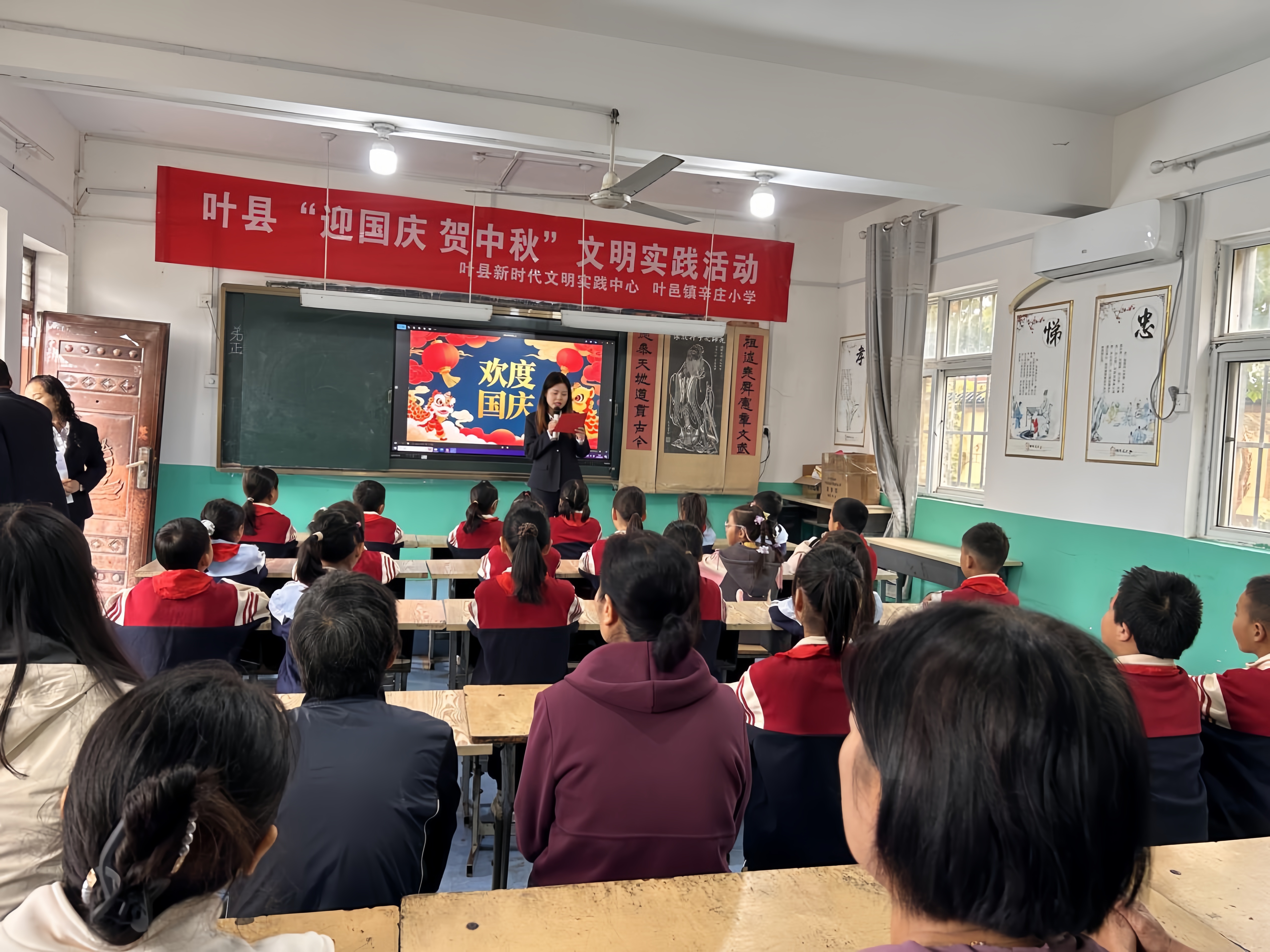 主持人曹红娜老师介绍了出席活动的各位领导,包括叶县新时代服务中心主任刘烨、副主任孙彬彬,以及叶邑镇中心校书记郝东伟,并对他们的到来表示热烈欢迎。接着,曹老师围绕中秋节的历史渊源、文化习俗以及国庆节的由来与时代意义,开展了生动有趣的主题讲解,帮助同学们深入理解传统节日的文化内涵。