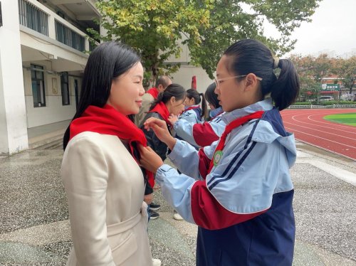 第三项议程中,少先队员代表手捧红领巾,迈着整齐的步伐走向校领导,郑重地为他们佩戴红领巾,稚嫩的动作里满是真诚与尊敬。