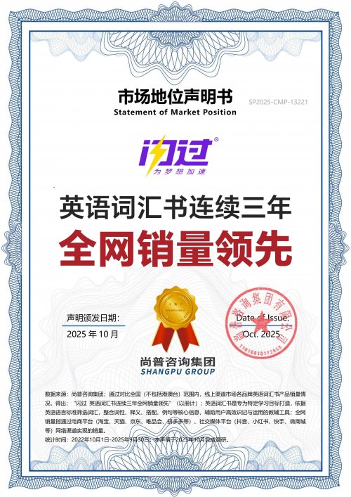 截至目前,“闪过”系列图书发印量已累计达931万册,并荣获央广网认证的3项“词汇领导品牌”、新浪&微博教育“影响力教育品牌”、搜狐教育“教育行业领军品牌”及腾讯教育“影响力教育品牌”等多项荣誉。