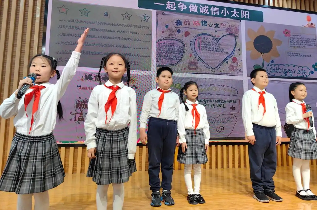 从学校到班级,最终的落脚点是学生的成长。来自二年级、四年级和六年级的学生小组代表登上舞台,展示他们的任务探究过程和收获。二年级学生分小组汇报实践收获,以讲述故事、社会调查、自编话剧等方式生动演绎,深入探究“诚信”内涵,化身诚信传播小使者。四年级学生聚焦“自由”与“责任”的平衡,借助问卷调查、辩论赛、创意制作等活动,展示对两者关系的理解,明确自由是需要建立在责任基础上,并受法律、规范约束的。六年级学生以“富强”为主题,展示“天问一号”工作原理、大国担当案例等成果,深刻领悟个人努力与国家强盛的紧密联系,深情朗诵原创诗歌以表达对祖国的美好祝愿,感动在场所有观众。学生的出彩展示,生动展现了“进阶式大任务”在价值观内化与实践能力培养方面的卓越成果。