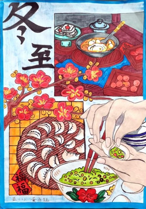周二至周五,同学们化身“小小设计师”,围绕“冬至的习俗、故事、美景”等主题创作手抄报。画纸上,饺子、汤圆、雪景等冬至元素跃然纸上,水彩、彩铅、马克笔等多种绘画形式搭配工整的文字,主题鲜明、色彩协调、排版美观,每一幅作品都饱含着同学们对传统节日的热爱。一幅幅精心创作的手抄报,成为校园里一道靓丽的文化风景线。