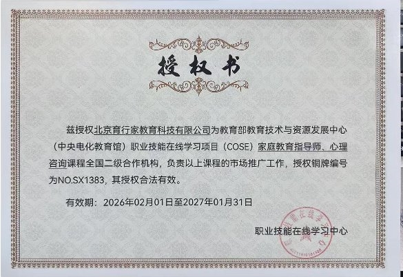 在这样的行业背景下,拥有一份正规、专业的家庭教育相关证书,不仅能系统提升个人家庭教育能力,更能为从事家庭教育相关工作奠定坚实基础。育行家作为中央电教馆授权合作单位,推出的高级家庭教育指导师证书,依托中央电教馆的正规资质,成为众多家庭教育从业者和爱好者的首选,用专业与正规,为学习者搭建起通往家庭教育专业领域的桥梁。